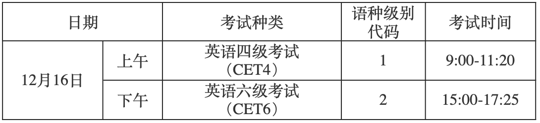 英语四级口语考试(CET-SET4)时间为11月18日(F233次),英语六级口语考试(CET-SET6)时间为11月19日(S234次)。口试采用机考方式进行,公司在南望山校区设立CET-SET考点。具体场次安排如下: