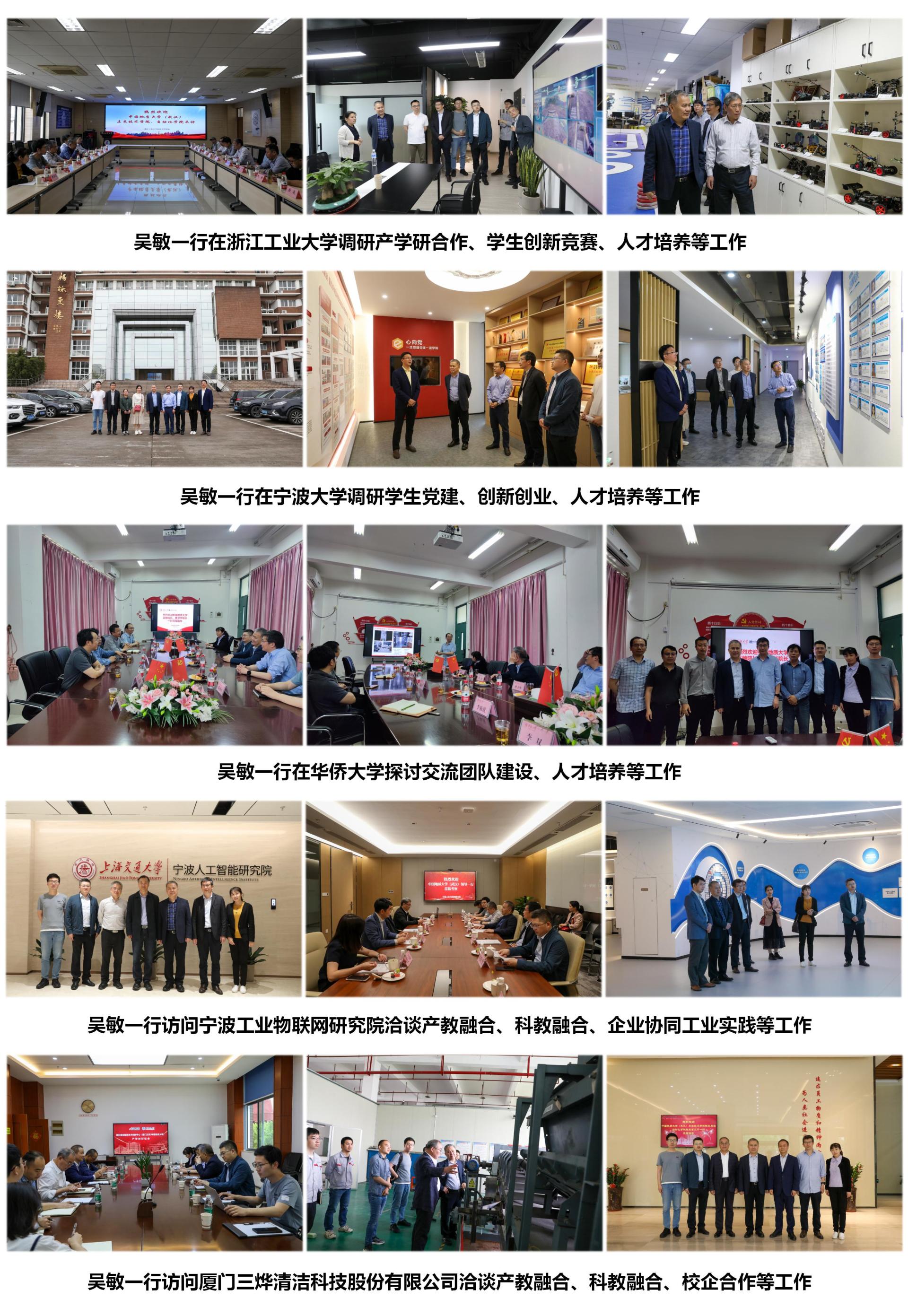4月19日至21日,调研组先后走访了浙江工业大学、宁波大学和华侨大学等高校,以及宁波工业物联网研究院、厦门三烨清洁科技股份有限公司等企业。此次调研组主要有三项任务,一是学习和调研兄弟高校在立德树人、人才培养、员工思想政治工作、员工党建工作、员工创新创业、导师团队建设等方面的做法和经验。二是对接企业,落实2021级本科生和研究生产学研工业协同实践课程,协调实习周次、实习场地、实习生活等相关安排。三是拓展校企合作渠道,探讨未来校企合作的重点方向及模式。