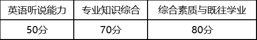2.综合面试。重点考察考生的思想政治素质和品德考核、专业综合能力、创新潜质和能力、外语能力水平、综合素质评价、心理健康状况等。综合面试一般包括考生自述、考生随机抽题作答、面试小组提问交流、专家评分等环节,考核时长一般不少于20分钟。综合面试满分200分,《面试考核评分细则》见附件3。各部分分值及占比如下: